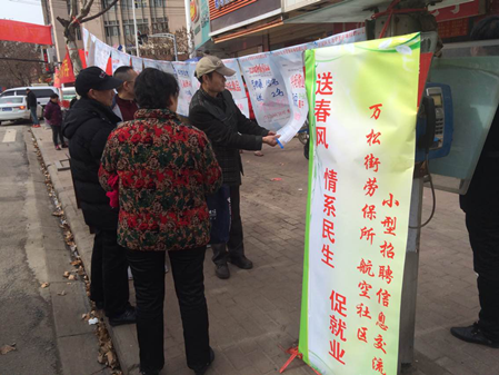 今日,利用航空社区开展“扬雷锋精神 续文明新风·唱响主旋律 传递正能量”的活动间段,在万松街办事处分管领导和万松街劳保所所长的组织下,在航空社区举办了“春风行动——送春风 情系民生 促就业”专场小型招聘交流会,共有30家用人单位参加,提供岗位超过80多个。除了在现场开展公益免费招聘服务活动外,还设立了劳动政策咨询、维权投诉等服务点,并向辖区人员免费发放宣传资料,和就业指导咨询。