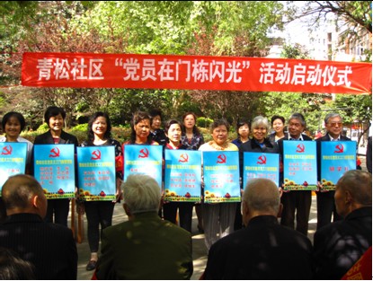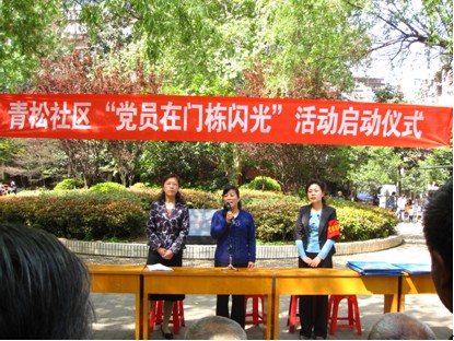 为深入开展创先争优活动,4月19日上午,创先争优示范社区万松街青松社区党委组织90余名社区党员在青松社区中心花园举行了 “党员在门栋闪光”争创“四员”活动的启动仪式。街工委领导和13个兄弟社区的专职副书记参加了此次活动。