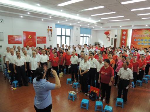 五、居民积极参与、认真排练,居委会全力支持。本次活动居民不是被动的参加,而是参与部分活动的决策(如:自由确定方阵队伍,比赛曲目由各方阵队自己确定),因此居民的参与性很高。自由组合的五个方阵队的领队将组合情况和参赛曲目报居委会。在各方阵队排练的过程中遇到歌词记不清,没有排练场所等问题,居委会全力配合。社区工作人员在网上查询歌词,并打印相应的份数分发给各方阵队。社区将会议室、活动室、党员群众服务中心等场所清理出来,并配备桌椅、空调、电扇、钢琴、扩音设备等供居民们使用,方便居民排练。5月初,各方阵队就开始了认真的排练。参加本次活动的人员大多是退休在家的老同志,他们克服各种困难(如:行动不便,照料孙子,做家务,路途遥远、天气炎热等)抽出时间参加排练。