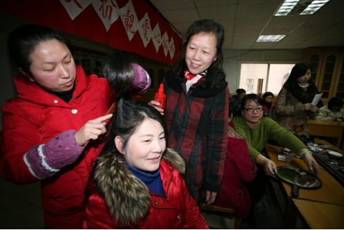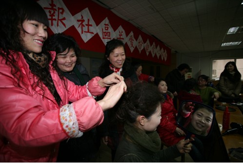 青松社区地处武广商圈,外来务工人员多,他们大多忙于工作,无暇照顾孩子。6年前,12名社区女工作者成立“爱心妈妈辅导站”,开办“四点半学校”,每天3人一组轮流值班辅导“流动花朵”做作业、玩游戏,直到晚上6时再将孩子们送到家门口。每逢寒暑假,“爱心妈妈辅导站”全天候接纳孩子,带领孩子们参与各种社会实践活动,彻底解决社区双职工家庭小孩无人照顾的问题。3月1日下午,4位“流动花朵”的妈妈来到社区为“爱心妈妈”们化妆、美容、美发。不一会儿,几位靓丽、时尚的妈妈便展现在众人面前。