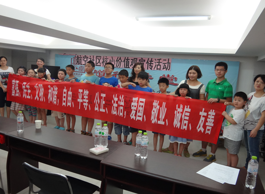 为在社区青少年中深入开展社会主义核心价值观宣传教育和实践活动,通过宣传教育、示范引领,努力让社会主义核心价值观在广大青少年中内化于心、外化于行,坚持以文化人、以文育人,积极运用文化产品、文化服务和文化活动潜移默化地进行价值观引导,2014年8月26日上午,航空社区举办了一次别开生面的青少年暑期教育活动,辖区内共二十余名青少年参与了此次活动。