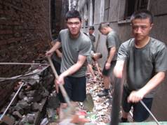 6月11日上午11点,公园社区志愿者和警备司令部10名战士一起,顶着烈日、冒着酷暑来到万松园路29号内,对院内的卫生死角进行了全面集中清理。