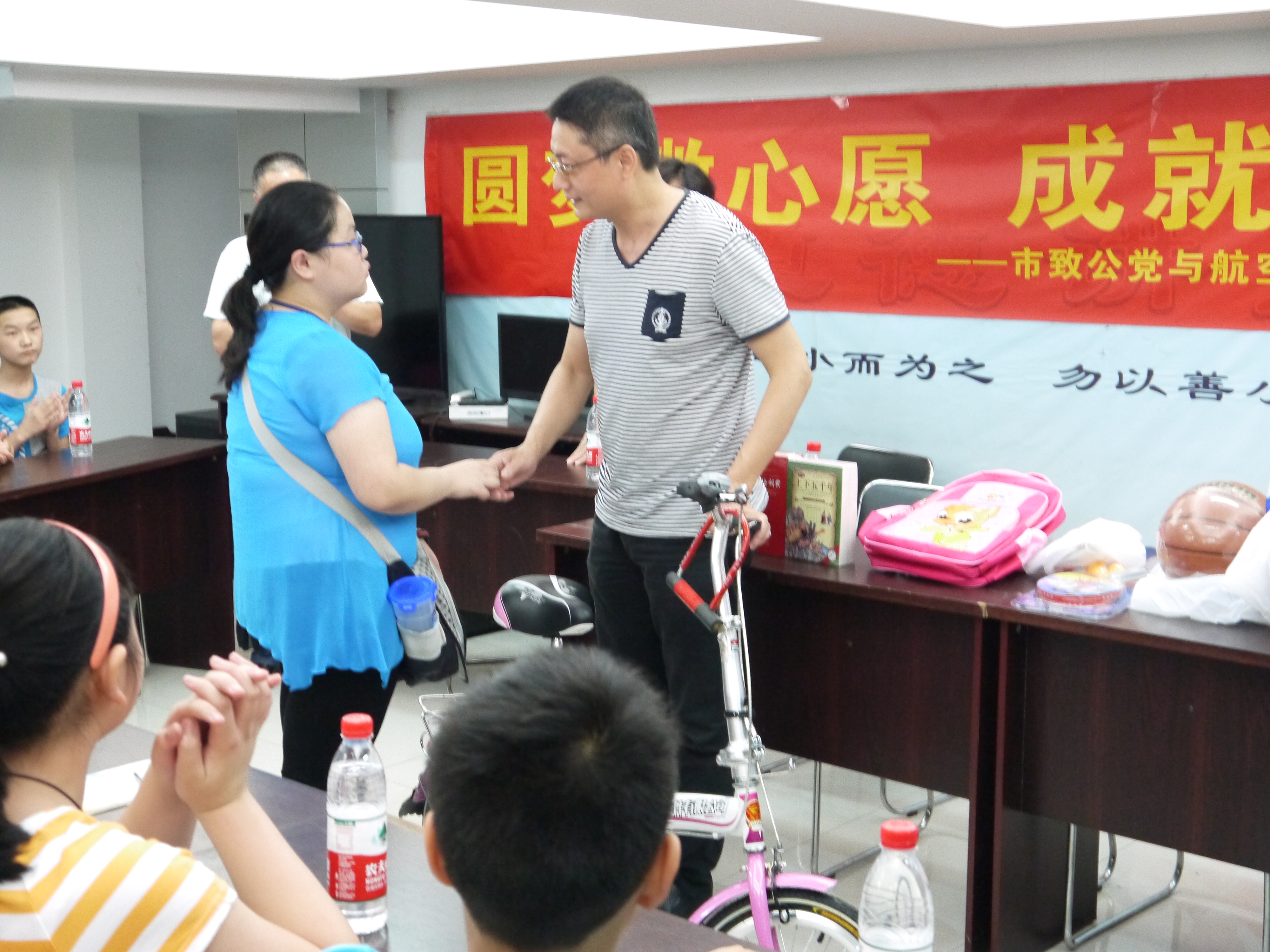 活动第一部分,由市致公党委员会的领导慰问辖区内困难家庭、流动人口、农民工子女的代表,并实现他们的微小心愿。他们是来自16个贫困家庭的小孩,他们中有肢体残疾和听力残疾的孩子、有父母双双下岗,生活困难的孩子、有来自农民工外来打工家庭的孩子。市致公党委员会依照他们的心愿清单,提供了自行车、书包、篮球、乒乓球拍、词典、课外书籍、文具等精美礼品,并嘱咐他们好好学习,报效祖国。孩子们接到礼品,开心不已,感谢社区和市致公党领导的关怀,他们会努力学习,回报社会。