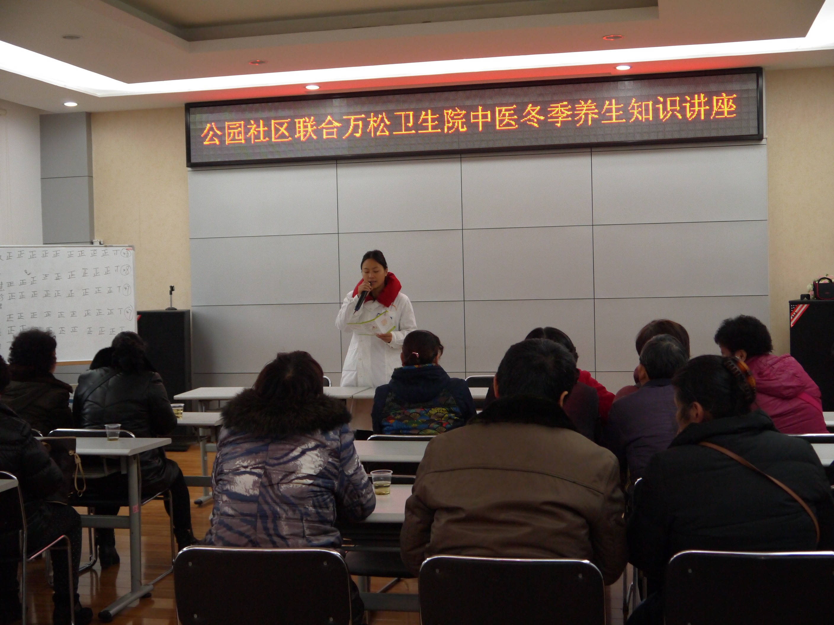 冬日的室外温度有些凉意。对于老年人来说,冬季由于抵抗力差是疾病高发的季节。为关爱辖区退休老人身体健康,提高老年人的健康意识和自我保健的能力。今天上午,在公园社区二楼会议室内,一堂冬季养生保健知识讲座正在进行。主讲人是万松街卫生服务中心的杨医生。听众是20多名辖区居民。