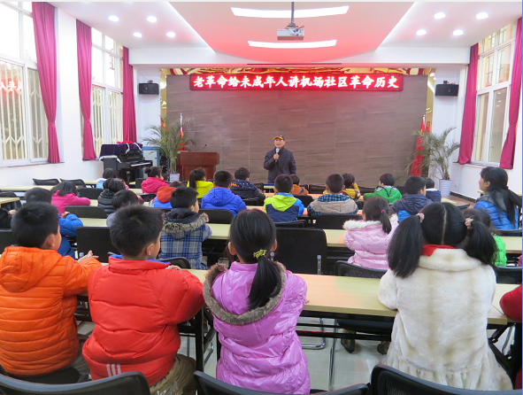 2月27日下午,机场社区结合本辖区部队离退休老干部多的特点,同时也是为了丰富社区孩子们的寒假生活,特邀请营房村休干所81岁的老革命王建华同志,以社区“机场记忆”陈列室展示的历史图片为背景,结合即将到来的“抗战胜利70周年”契机,为未成年人讲述革命故事,讲述机场社区的由来,讲述保卫武汉的历史战争故事,激发同学们爱国热情,王老用自己的亲身经历,从自己16参军到参加抗美援朝战争,和敌人浴血奋战的革命故事,以亲身经历,真实故事,给孩子们讲红色革命故事。