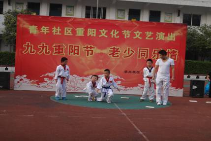 参加活动的主要是社区的空巢老人、孤寡老人和社区居民,共300多人。整场演出生动活泼,充满乐趣,颇有特色。所有节目都是社区居民参与,不管是主持还是演出人员全是社区居民及社区工作人员。节目老中青一起参与,老少同乐,共庆重阳佳节。社区青圆合唱队的队员演出的大合唱《中国 中国 鲜花的太阳永不落》和《夕阳红》拉开了演出的序幕。太极队的队员们表演了太极二十四式和太极功夫扇,尽管动作不是很规范,但一招一势也有模有样;卫星村小学三年级二班学生的《三字经》朗诵使大家又重温中华传统文化的敬老美德。共建单位江汉区团委推荐的五人跆拳道表演赢得了居民的阵阵掌声;社区主任颜建社深情演唱的《鸿雁》把人带到了无边的大漠,而王治平的一曲《我为祖国献石油》更是唱出了社区工作者的豪迈,青年群干王慧、朱晨自己编排表演的舞蹈《青春飞扬》更是展现了社区人的风采。