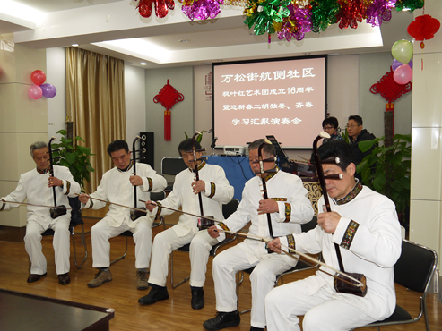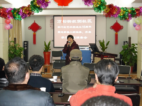 1月27日,寒冬细雨、腊八飘香,航侧社区里暖意融融,二胡器乐、乐声回荡。万松街航侧社区“枫叶红艺术团”成立16周年暨迎新春二胡独奏、齐奏学习汇报演奏会在二楼活动大厅隆重举行。