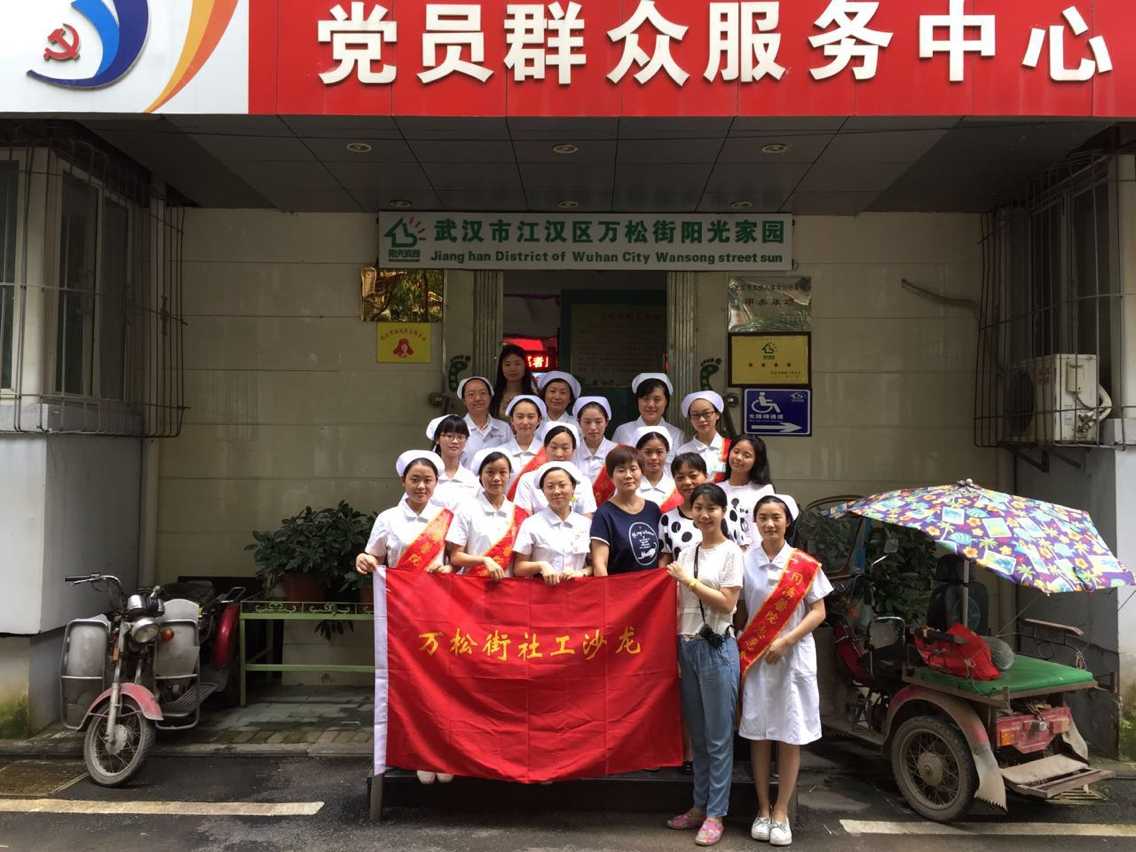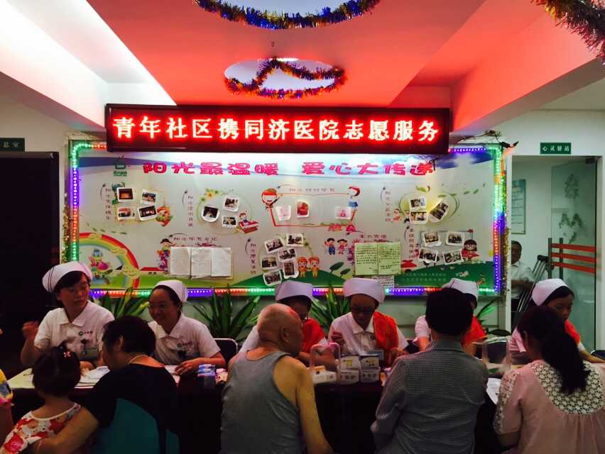 7月22日,青年社区社工沙龙志愿者携手同济医院心血管内科医务志愿者一起为辖区老人、阳光家园残疾人免费检查血糖、血压,同时现场向辖区居民讲解健康知识。