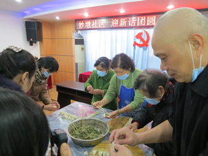活动现场分工明确,和面、拌馅这种力气活社区鲁主任首当其冲,大家争先恐后拿出自家手艺包出形状迥异的元宝饺、波波饺、马蹄饺、蛤蜊饺,大家边做边拉家常气氛融洽。在现场采访的胡记者(湖北电视台公共频道)发出感慨的讲:“妙墩社区就像一个兄弟姐们众多的和谐大家庭!”