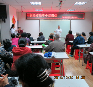 为了增强老年人的自我保健、防病强身的意识和能力,树立老年人科学健康的生活方式,营造“增强健康意识,科学自我防范”的氛围。10月30日,万松街居家养老服务中心邀请街社区卫生服务中心在中心活动室举办“中医治疗慢性疾病----高血压”的健康知识讲座,此次活动有50余人参加。讲座上,万松卫生服务中心的张医生、韩医生结合自身的工作经验,深入浅出,用通俗易懂的语言,详细讲解了《心脑血管疾病》、《高血压》、《糖尿病》、《中风》这四种中老年人常发病理及预防措施,就如何做好合理膳食、如何合理运动并保持心态平和,提高自身免疫力,增强抗病能力和老年人眼疾症状、癌症病征等知识作了交流。医生们语重心长的告诫、富有哲理的语言赢得了在座的中、老朋友的阵阵掌声。通过举办中老年人健康知识讲座,普及了健康知识,同时也进一步增强了老年人对健康知识的了解,激发了老年人关爱自己、关爱健康的自我保健意识。讲课结束后,许多老同志就一些自己关心的问题向医生咨询,进行了互动交流,在现场免费为老人测量血压、血糖、听力等相关检查。此次活动得到老人们的大力支持,同时希望以后万松街养老中心经常举办类似活动。