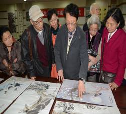 武汉市文史馆馆员、知名书法家瞿忠谋、书法家高洪斌、中国山水画家刘军参观了丹阳书画社成员的书画作品。知名书法家瞿忠谋现在对书画社成员易刚建老师的作品进行点评说:“您的字写得不错,字的结构也掌握的很好,只是对大家的作品我们应该能够掌握整体的神韵而不能随意创意,破坏了原有的意境。”随后,瞿大师对在场每一位成员的作品都作出了点评,指出他们作品的成功之处和不足之处,瞿大师的一席话得到了书画社成员的点头称是,纷纷表示瞿大师的点评精辟,直指问题所在,让大家都觉得获益匪浅。点评后,三位知名书画家现场泼墨为丹阳书画社的成立题字、作画。