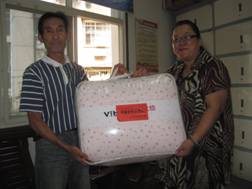 为老人志愿者送棉被
