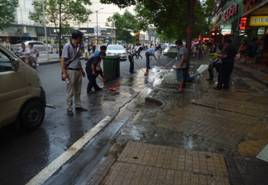 地处武广商圈的武商路餐厅林立,油污排放严重,路面污染大,影响市容环境,阻碍了行人和车辆的正常行走。万松街城管和武展社区为了迎接全国文明城市创建,于8月27日下午组织街城管队员、社区干部、环卫所以及武商路上的餐饮经营者共计30余人,对武商路上餐饮门点前的油污进行了大清洗。