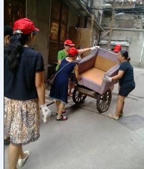 图为在园林村10号等门栋清理居民丢弃的旧沙发、席梦思等物品