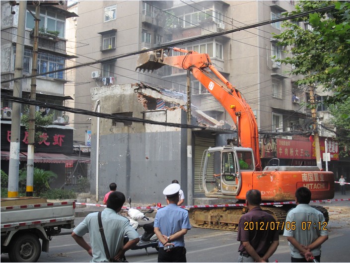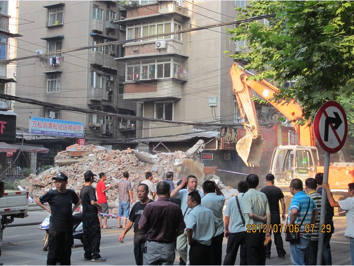 2012年7月6日早上6时半至8时,区城管局拆违专班、区交管大队、区公安分局、万松街拆违专班共120余人对万松小区44栋前附楼(原小区建设临时配电房)上下两层200平方米砖混结构房屋进行了拆除。区、街领导、区城管执法大队、区控违中队及街城管科、街城管中队等负责人参加拆违行动。