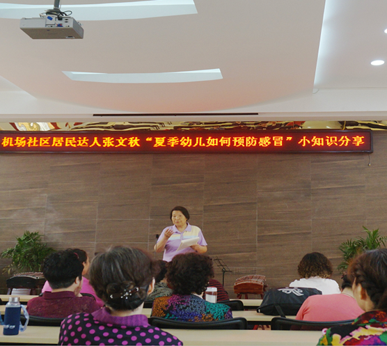 5月6日上午9:30,机场社区居民议事厅一片安静,一群居民早早就来到议事厅,听居民达人张文秋讲“夏季幼儿如何预防感冒”小知识。