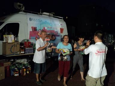 上午九点多,干休所的老干部们爷爷、奶奶们早早搭好了场子,电视台转播车旁的桌子上摆满了各种礼品,社区书记、主任沈林莉松与营房村干休所工作人员也是忙前忙后进行各项协调工作。晚上武汉电视台“开心有礼”栏目组来到机场社区大操场,7时30分灯光照亮了社区大操场,节目主持人“健哥”顶着他那标志的光头出场了,混杂着武汉话和普通话诙谐的与现场观众打着招呼,立刻就赢得大家的一片掌声。