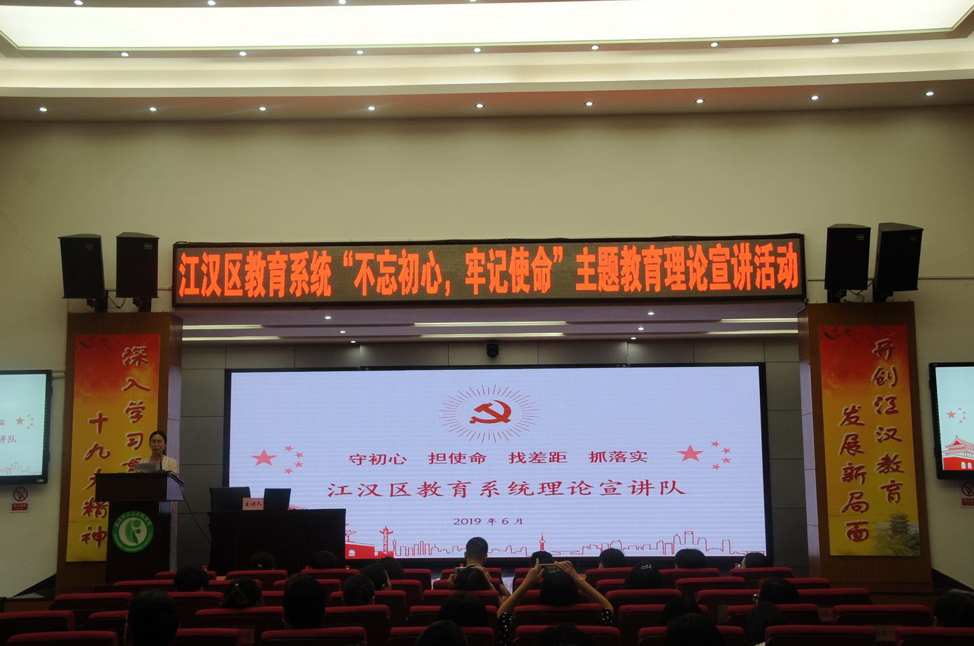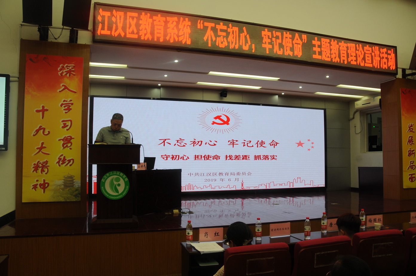 为隆重庆祝中华人民共和国成立70周年,不断深化习近平新时代中国特色社会主义思想和党的十九大、十九届二中、三中全会精神的学习宣传,根据区委宣传部统一部署,6月25日,中共江汉区教育局委员会举行全系统理论宣讲队成立仪式暨首场主题宣讲活动。本次活动邀请区委宣传部领导,花楼水塔街工委、前进街济生社区和永安社区党员代表出席活动。