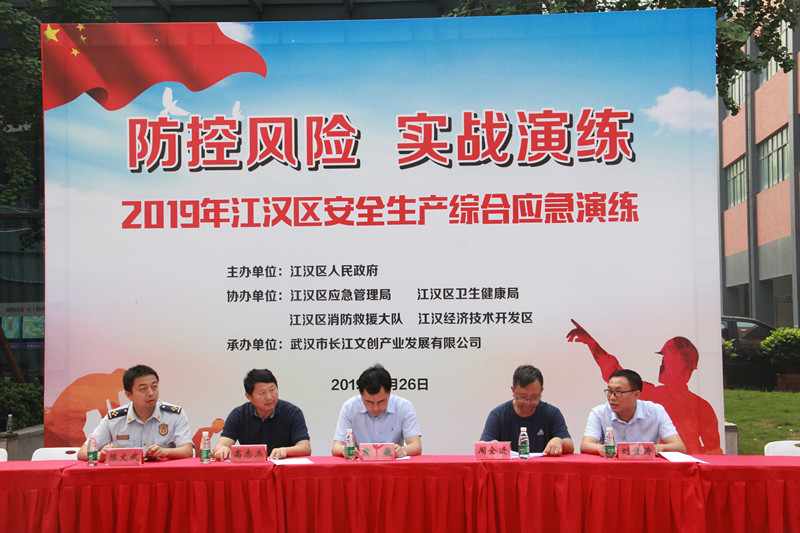 6月26日上午9时,2019年江汉区安全生产综合应急演练在武汉市长江文创产业发展有限公司红T举行。区应急管理局、区卫健局、区消防大队、江汉经济开发区、武汉市长江文创产业发展有限公司联合开展生产、消防安全演练活动。