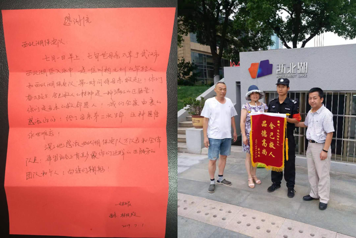 7月1日上午9点20分左右,一名七旬老太太因不堪糖尿病折磨,一时想不开,来到西北湖广场西湖边,跳入湖中寻短见。老人落水地点就在西湖人防小森林公厕前,发现有人落水后,正在附近区域巡查的西北湖绿化广场的保安队员和一位路过的市民柯先生赶紧跳入湖中搭救,在广场工作人员紧急调度下,正在水上作业的职工开船赶到现场,在众人的合力救助下,老人幸无大碍。将老人救上岸后,工作人员安抚着老人的情绪,为老人送上了纸巾和水,同时询问老人亲人的联系方式,并第一时间与其家人取得了联系。30分钟后,老人的女儿胡女士赶到,向大家表示了感谢,并将老人接走。隔天,胡女士专程来到西北湖绿化广场,送来了感谢信和锦旗,向救助老人的工作人员和保安队员表达了感激之情,并为西北湖绿化广场职工奋不顾身、舍己救人的社会正能量点赞!