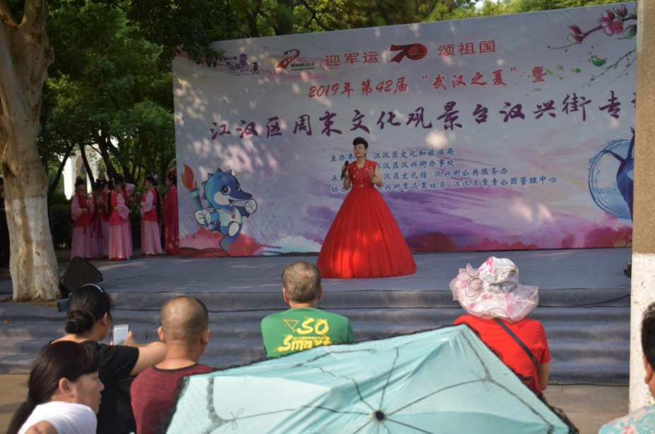 为迎接军运会的到来,共庆伟大祖国70周年华诞,近日,江汉区常青公园联合江汉区文化局、旅游局、江汉区汉兴街办事处、江汉区文化馆、汉兴街公共服务办、汉兴街常远里社区共同举办了“迎军运、庆国庆、颂祖国”文艺汇演活动。