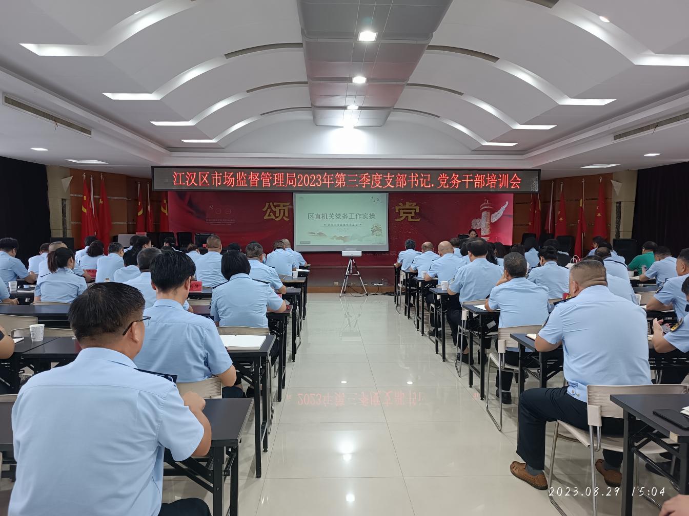 为认真学习贯彻习近平新时代中国特色社会主义思想和《中国共产党支部工作条例(试行)》,持续提升基层党建标准化规范化建设水平,8月29日下午,江汉区市场监督管理局召开2023年第三季度支部书记、党务干部培训会,会议由局党组成员、副局长、机关党委书记黄涵主持,各党支部书记、党建工作人员共60余人参会。