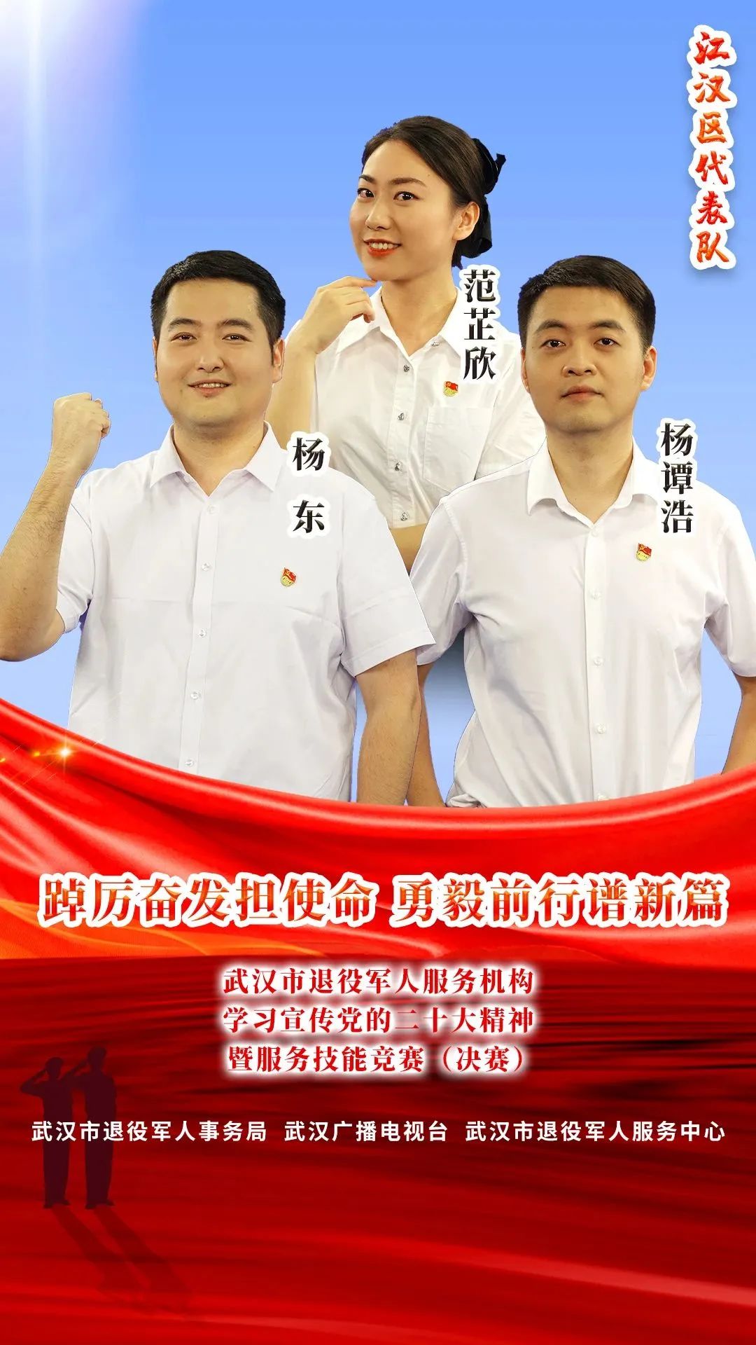 今年4月起,武汉市退役军人事务系统举办武汉市退役军人服务机构服务技能竞赛。通过充分发动、广泛动员,全市3458家退役军人服务机构全体工作人员参赛,经过初赛、复赛、决赛三个阶段,江汉区代表队获得团体三等奖。在演讲展示环节中,江汉区代表队选手范芷欣荣获第一名。