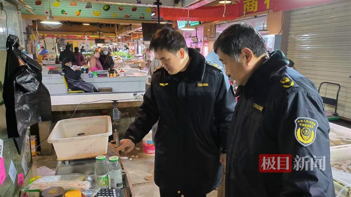 1月22日上午,江汉区市场监督管理局执法人员到位于武汉市江汉区常青五路的杨汊湖菜市场,对商户的电子计价秤进行突击抽查,并随机抽样快检了部分商户的蔬菜、肉类等。