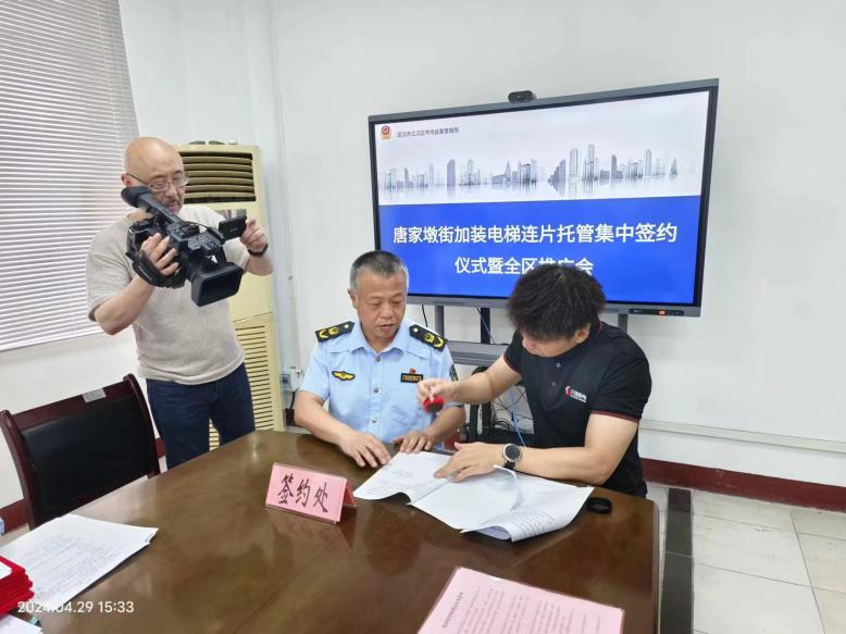 4月29日下午,江汉区唐家墩街老旧小区加装电梯“连片托管”签约仪式在唐家墩市场监管所落笔。江汉区市场监督管理局总工程师吴钢、唐家墩街道办事处人武部部长郑波、江汉区市场监督管理局特种设备科室负责人、唐家墩市场监管所负责人、武汉市梯管家物业服务有限公司、湖北元速机电工程有限公司、武汉电视台等新闻媒体及业主代表出席了本次签约仪式。