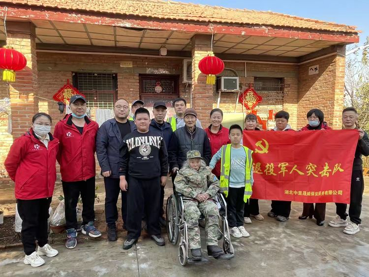 近日,在江汉区退役军人事务局的指导下,由江汉区军创企业湖北中昱晟威保安服务有限公司与武汉楷诚物业管理有限公司、武汉市江汉区民意街民枫义警联合会联合发起,并得到交通银行武汉江汉支行的积极响应,共同组织了一支退役军人突击队,探望了新中国第一位女空降兵、传奇英雄马旭老人,开展了“关爱退役军人,退役不褪色”主题慰问活动。
