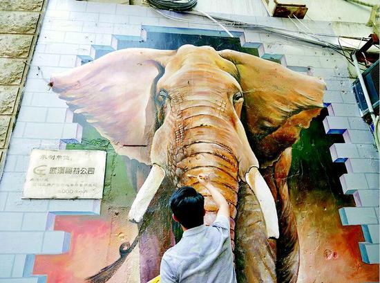 一只大象破墙而出、巨人伸出大手触碰宝藏箱。近日,中山大道和江汉路步行街上出现了多幅大型彩绘墙画,其中包括3D立体画,人与画融为一体拍照,俨然成了新的“网红景点”。