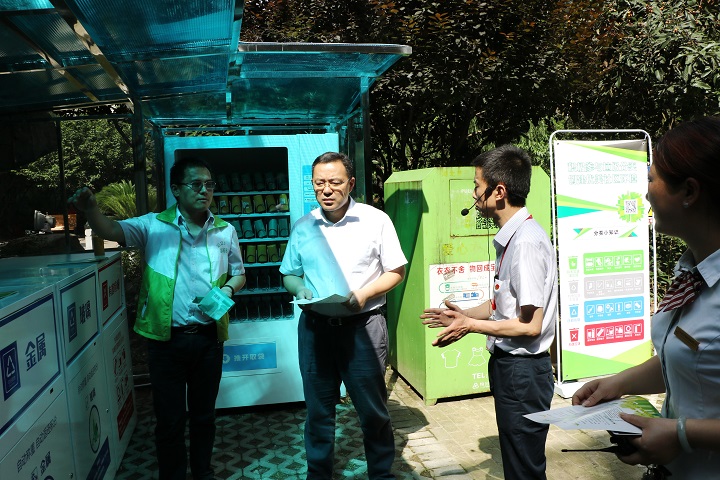 在崇安鑫城小区,张书记在工作人员的陪同下,体验了新推出的垃圾分类便民服务。他表示,将小区垃圾进行分类,是一项光荣而艰巨的环保事业,社区采取积分兑换鼓励垃圾分类的方式很好,有助于居民良好环保意识和习惯的养成。