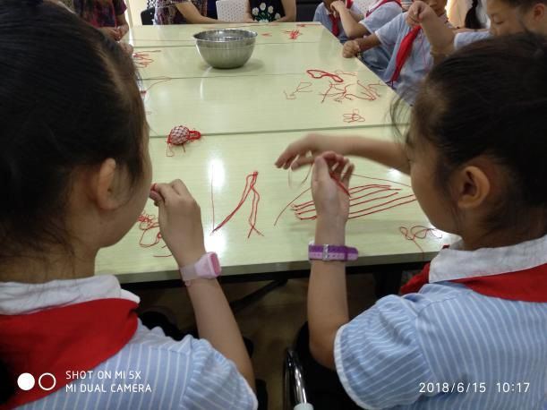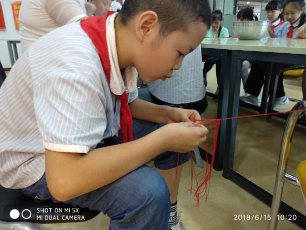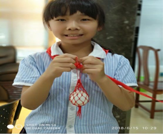活跃热闹的氛围仍然在继续,大家开始学编盐蛋网,大家都在认真听社工和奶奶们讲解编制技巧,认真编制。