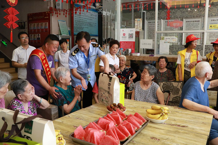现场活动热闹非凡的同时,民意街办事处副主任毛芸带领志愿者队伍也前往了养老院,为老人朋友们送去了节日祝福和慰问物资。五星志愿者专门看望了住在福利院的百岁老人。