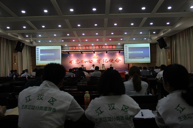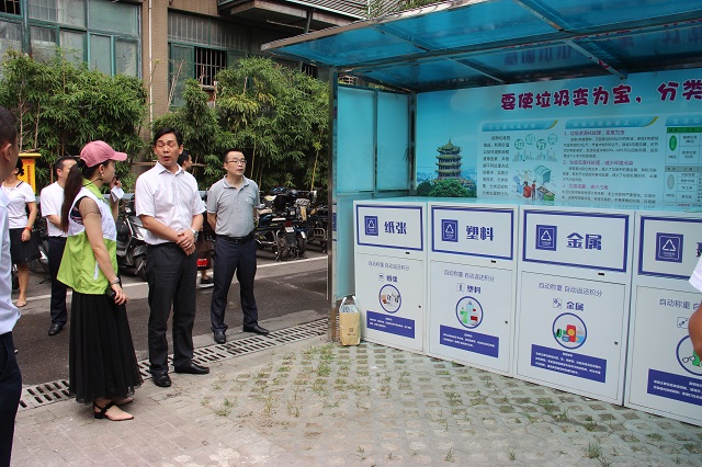 2018年7月26日上午,江汉区在民意街召开了全区生活垃圾分类工作推进会。会前,副区长彭勇军带领相关职能部门及街道分管领导实地考察了民意街多闻社区崇安鑫城小区垃圾分类示范点。民意街工委书记吕良和办事处主任余建清向彭区长介绍前期垃圾分类工作情况,武汉众资绿源环保科技有限公司工作人员现场介绍了崇安鑫城小区垃圾分类运作模式,并讲解智慧垃圾分类投放系统。彭区长现场体验了智慧垃圾分类投放系统和环保材料,多闻社区书记现场展示介绍垃圾分类宣传工作。彭区长对民意街前期垃圾分类工作给予了肯定,并对民意街智慧垃圾分类投放系统的入户宣传知晓率和正确使用率达到80%予以赞许。