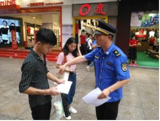 队员向市民、商铺发放《告市民书》,为军运会营造良好的舆论氛围。