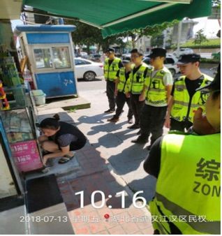 炙热的高温炙烤着江汉路,脚下的柏油马路翻滚着热浪,然而高温酷暑并没有阻挡江汉路中山大道执法中队队员们的步伐。为即将来临的军运会营造干净整洁的市容环境,执法中队队员们头顶烈日,挥汗如雨,在近40度高温的天气下坚守岗位,劝阻占道、出店经营、规范车辆停放、治理非法广告、清理乱堆乱放、排查煤气安全、提升城市品质……