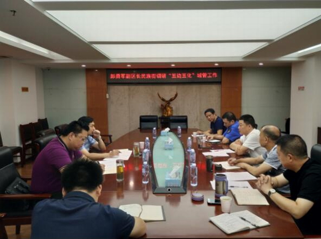 2018年7月31日上午江汉区副区长彭勇军、应急办主任宋俊来到民族街,对民族街“五边五化”城市综合管理工作开展情况进行调研,街办事处主任王善鼎代表街工委、办事处,从街道城市综合管理长效机制、街道硬件基础设施建设、街道特色亮点打造等三个方面及下一步工作打算向区领导作了汇报。