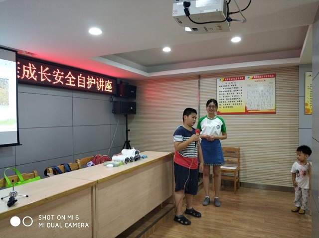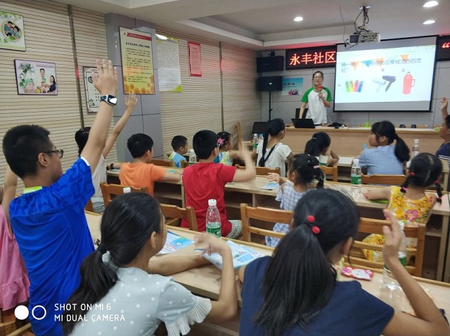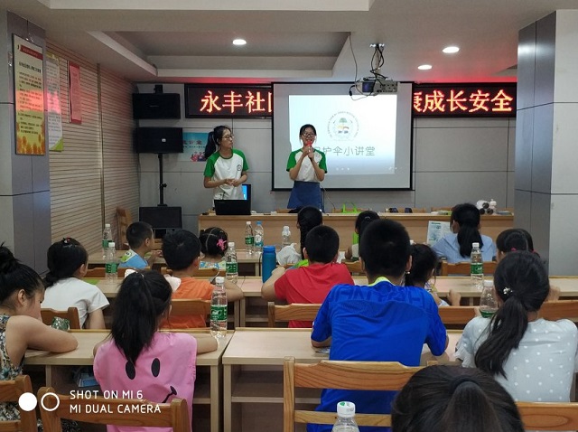2018年8月2日,民意街依托新青年下乡项目成功链接华中科技大学公共卫生学院保护伞志愿服务团队到永丰社区开展青少年健康促进活动。来自华中科技大学公共卫生学院的大学生们,为永丰社区的孩子们开展“法治安全自护”讲座,本次讲座从营养教育、健康的运动方式、意外伤害预防三个方面,通过讲解与问答相结合的方式,生动有效的为社区青少年拓宽了知识面,教会他们如何合理饮食,合理搭配,健康成长,两名大学生讲师通过播放以“保护伞”为主题的小视频和现场讲解的方式讲授了健康的运动方式、意外伤害预防,青少年们在现场踊跃发言,积极与大学生讲师们互动交流,区委宣传部的工作人员对华中科技大学的大学生们进行了采访。保护伞志愿服务团队表示:青少年是勇敢的,无畏的,也是创新的,活跃的,但同时正是由于青少年独特的天性,导致他们也是容易受到伤害的,在永丰社区开展本次“法治安全自护讲座”的最终目的是培养儿童青少年良好的饮食习惯以及自我保护能力,让新时代的青少年安全茁壮成长。