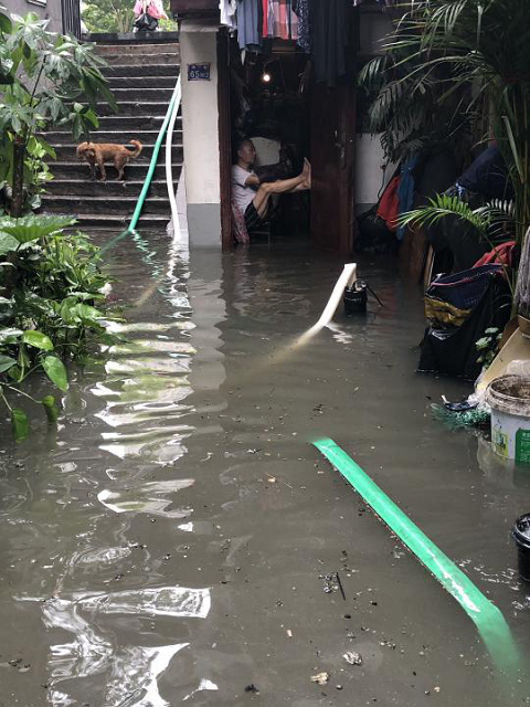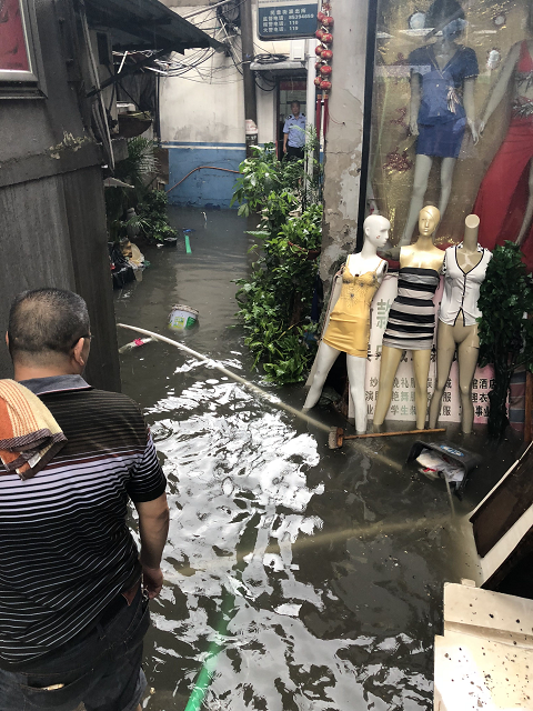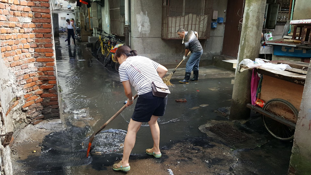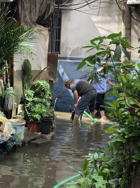 1日清晨7点突降大雨,再次让民意街天一巷变成一片“泽国”。警务室安保队员和社区工作人员共5人,迅速组织抽排工作,直到当天下午4点才抽排完。渍水期间,社区工作人员先后两次帮助患病居民家属,将病人背出、抬出渍水地带,并将退水后布满污泥的地面冲洗干净,确保一方平安。这是旧城区夏季降雨面临的共性问题,其根源在于地下排水管网陈旧、设计不合理、标准过低、雨污管合一。旧城改造是一个长期的系统性工程,需要逐步治理完善。第一,加大环保宣传力度。通过悬挂横幅、发放手册、LED屏播放、上门宣讲等多种形式,引导居民自觉养成环保意识,特别是夜市经营户合法合规经营,不将垃圾排入雨水井。第二,加强排水设施日常管理。定期对地下管道进行清淤工作,确保排水、行洪通畅,有条件可以在雨水篦子下面加设一个铁篮子,拦截冲入杂物。第三,提高排水应急处置能力。建立暴雨内涝监测预警体系,强降雨前排水薄弱地段事先准备好抽排水设备;健全信息共享与协调联动机制,通过QQ群、微信公众号等自媒体平台,第一时间向公众发布灾情,及时提供应急措施;第四,力争打造“海绵城市”。通过雨水管断接技术,利用社区内部的花坛、绿地等空间布置雨水花园、下沉式绿地,平时供休闲使用,暴雨用作蓄水地。