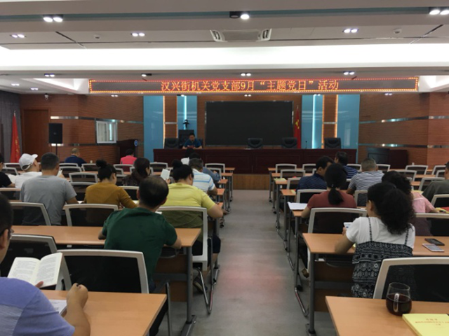 ——汉兴街机关支部9月主题党日 汉兴街机关支部9月主题党日在9月6日周四上午如期举行,机关党员佩戴党员徽章,携带党章和记录本,准时在机关五楼大礼堂参加活动。