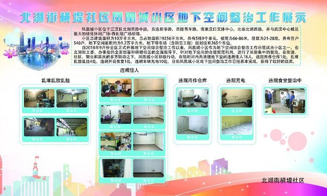 自2018年9月份全区正式开展地下空间综合整治工作以来,凤凰城小区作为地下空间综合整治工作示范试点小区之一,在北湖街工委、办事处的全面部署和横堤社区的全面指导下,针对地下空间的合理规范利用,进行了长期集中的整治。在街道、社区、物业和居民的多方联动之下,凤凰城小区积极行动,在短时间内共清理地下空间违规住人18人,违规用作仓库1处,乱堆乱放乱挂4处,违规开设食堂1处,违规车辆充电10处。目前凤凰城小区地下空间整治工作已经基本完成,获得了较好的效果。
