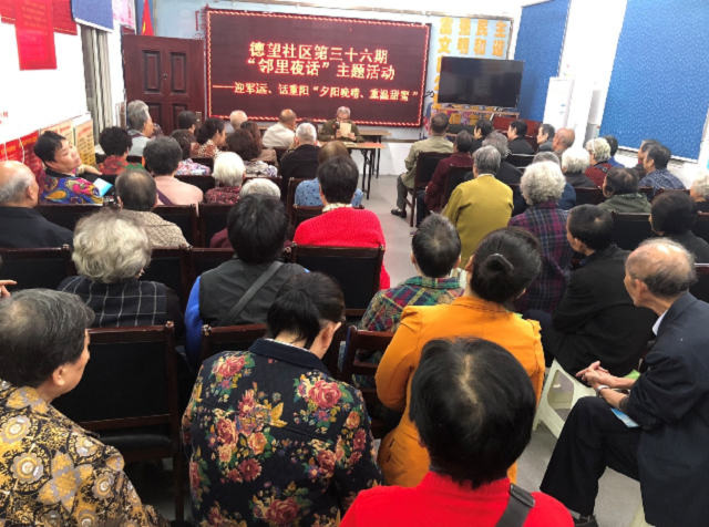 德望社区:为弘扬中华民族敬老爱老的优秀传统美德,10月16日,德望社区在活动室举办了金秋重阳节“邻里夜话”——“迎军运、话重阳”活动。