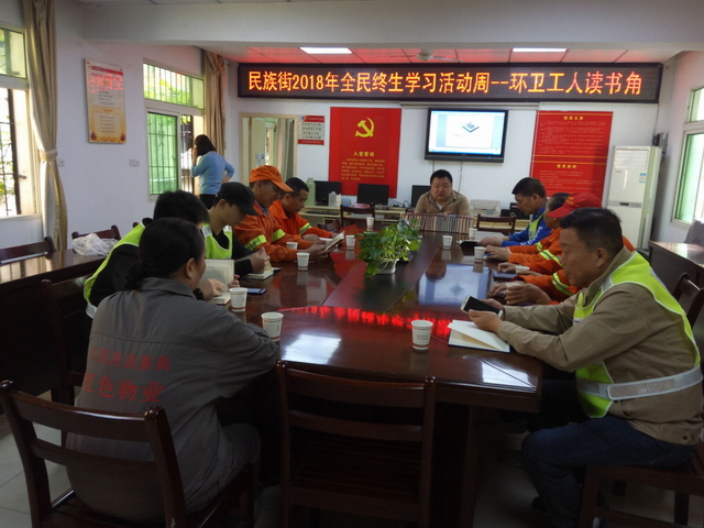为进一步加强精神文明建设,丰富一线环卫工人生活,满足环卫工人获取各类知识的需要和渴求,民族街和平社区于10月23日上午利用多功能活动室现有资源设立了民族街环卫工人图书角,购置了报刊架、杂志架及十九大、保健养生、旅游风景、时政新闻等各类书刊杂志百余本,使环卫工人在休息时能够通过阅读各类书籍拓展视野,丰富知识,提升自身工作能力和文化素养。