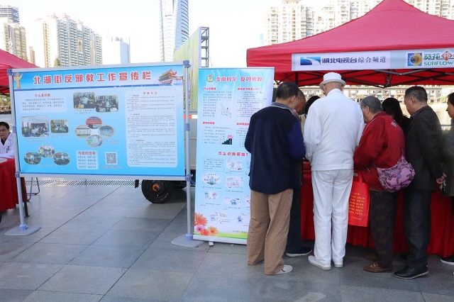 在“崇尚科学,反对邪教”反邪教宣传展台,反邪教专职工作人员通过悬挂宣传横幅、放置宣传板、发放宣传资料等形式,向居民宣传了崇尚科学、健康生活、反对邪教等知识,发放反邪教类宣传资料3000余份,关注武汉反邪教微信公众号300余人,提升了群众识邪、辨邪、防邪能力,消除邪教生存土壤。