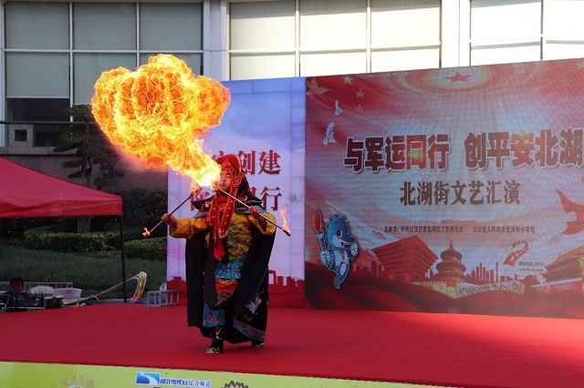 接下来,精彩的歌舞表演把气氛推向高潮。尤其是传统文化节目湖北大鼓、变脸等,以曲艺形式体现了北湖街平安创建工作的成效,深受群众喜爱。