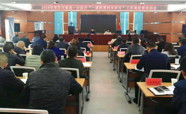 2018年11月26日上午,汉兴街提升“一感两度两率两专”工作调度暨培训会在街五楼会议室召开,全体党政领导、“4+2”科室负责人、16个社区书记、副书记等人参加会议。