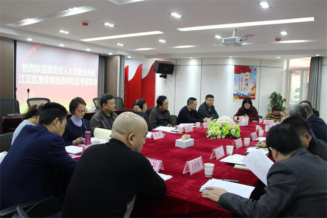11月29日,四川省自贡市人大常委会副书记杨征宇同志一行12人来我街西桥社区就人大工作进行学习考察交流。街分管人大工作领导万智华,西桥社区书记兼人大代表董守芝,武汉市人大常委会代工委主任任强、副主任刘颖萍,市人大代工委办公室副主任陈庚红,江汉区人大常委会副主任张明华、区人大代工委副主任张玲陪同到访领导参加了此次活动。