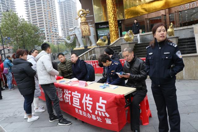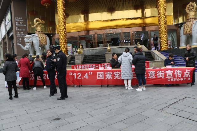 12月4日上午9时,民意街与辖区工商、食药监、派出所和司法所等部门在汉正国际广场联合开展了“12·4”国家宪法日集中宣传活动。活动以“尊崇宪法、学习宪法、遵守宪法、维护宪法、运用宪法”为主题,通过悬挂条幅标语2副,展出宣传展板1块,发放宣传资料500余份、普法环保袋300余份、普法挂图150余份,提供法律咨询50余人次等形式,开展了以宪法为核心的国家基本法律和劳动权益保障、妇女维权、计划生育、低保、食品卫生等与经济发展、服务民生相关的法律法规宣传,吸引辖区居民300余人参与,营造了良好的法治宣传氛围。