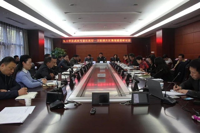 九三学社武汉市委副主委郭刚艳、付文芳,九三学社武汉市委秘书长、组织部长陈胜利,九三学社武汉市委常委、武汉大学政治与公共管理学院博导、教授上官莉娜,区长李湛、副区长彭勇军,区各有关委办局、万松街及相关单位负责人出席研讨会。部分基层组织主委及九三学社社内规划、建设、设计及交通领域的专家社员齐聚一堂,为万松园片区规划建设出谋划策。